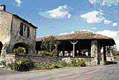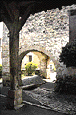 madera que se apoya contra una vieja casa con el piso bajo en arcada.